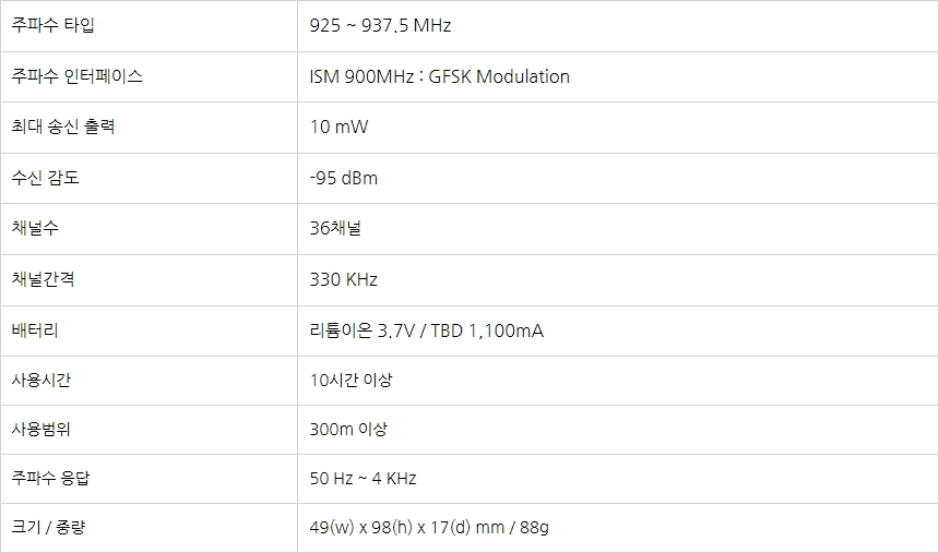 비도심권(평야지대, 개활지)에서 300M 이상 통신이 가능합니다.